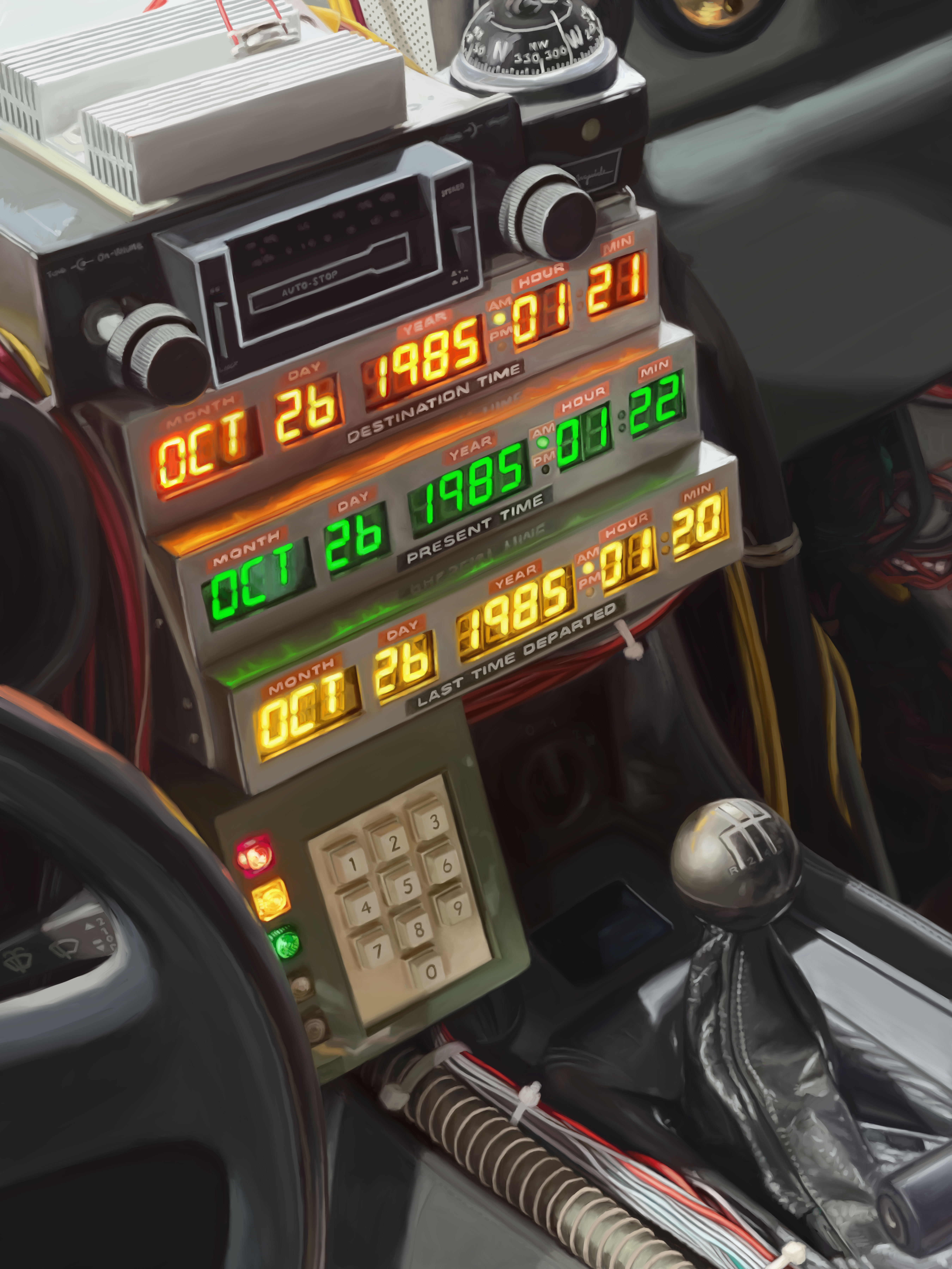 a digital painting of the legendary DeLorean from Back to the Future with its dashboard glowing with October 26, 1985 -- the night of the first experiment.